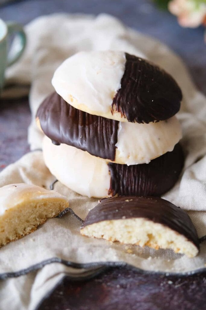 The Amerikaner is similar to the black-and-white cookies found in the United States: a disc-shaped, slightly convex cake base topped with frosting.