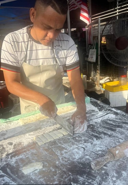 Jusoh Din separates the dough before frying the cakoi